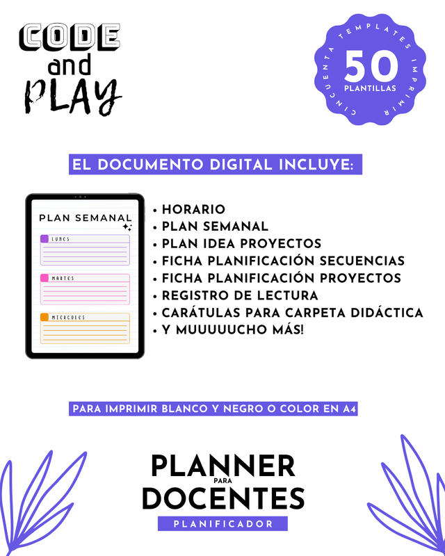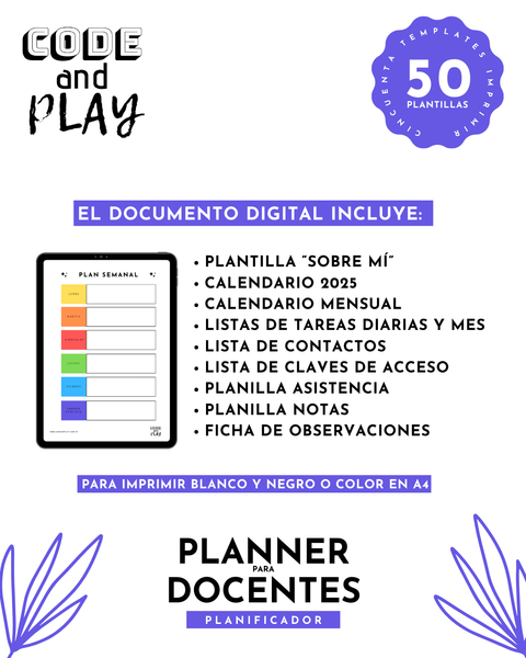 Diseñado para docentes que quieren organizarse en papel y tener su propia agenda personalizada según sus necesidades. Archivo digital en PDF listo para imprimir en Blanco y Negro o Color, en papel A4.